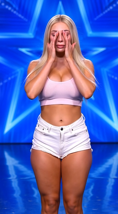 A beautiful young woman stepped onto the stage, wearing a simple short skirt and a soft, elegant top. She smiled nervously as she stood in front of the judges — Simon Cowell, Sofia Vergara, Heidi Klum, and Howie Mandel.